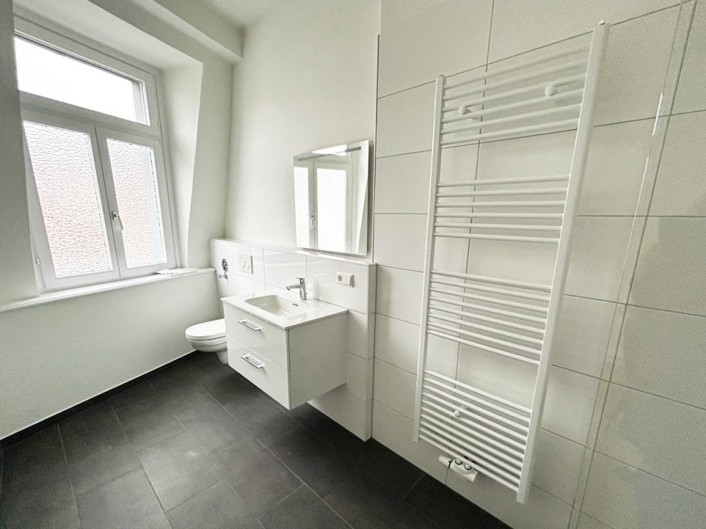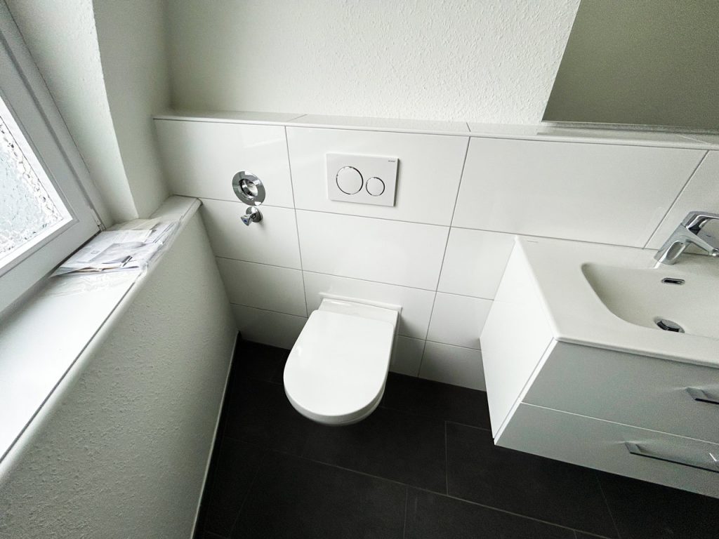 Ergebnis: Ein pflegeleichtes, helles Badezimmer mit klaren Linien, funktionaler Aufteilung und modernem Komfort – perfekt für den Alltag im Altbau.