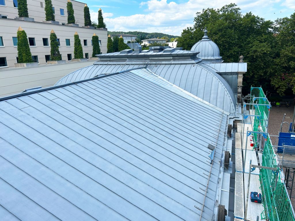 Ergebnis: Ein optisch und technisch aufgewertetes Blechdach mit dauerhaftem Schutz vor Umwelteinflüssen – und das historische Kurhaus erstrahlt wieder in neuem Glanz.