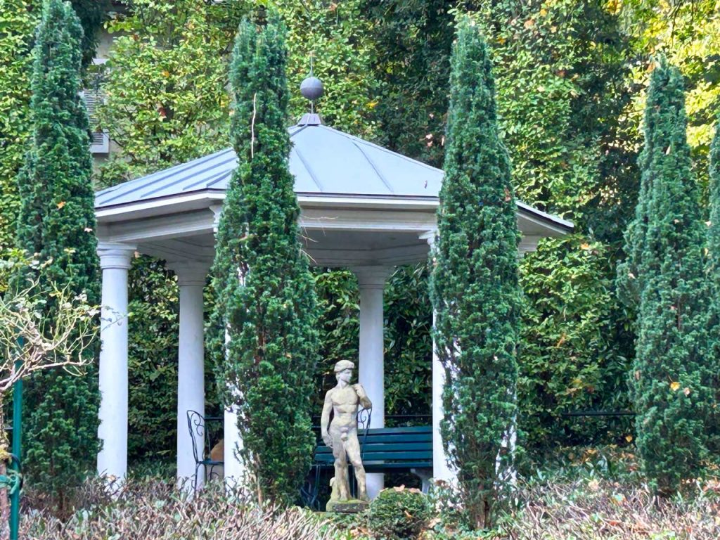 Das Dach des historischen Gartenpavillons war stark verwittert und vollständig mit Moos bedeckt. Im Zuge der Sanierung wurde die Holzkonstruktion erneuert und mit einer langlebigen Blechdeckung versehen, die sich harmonisch in die Gartenanlage einfügt.
